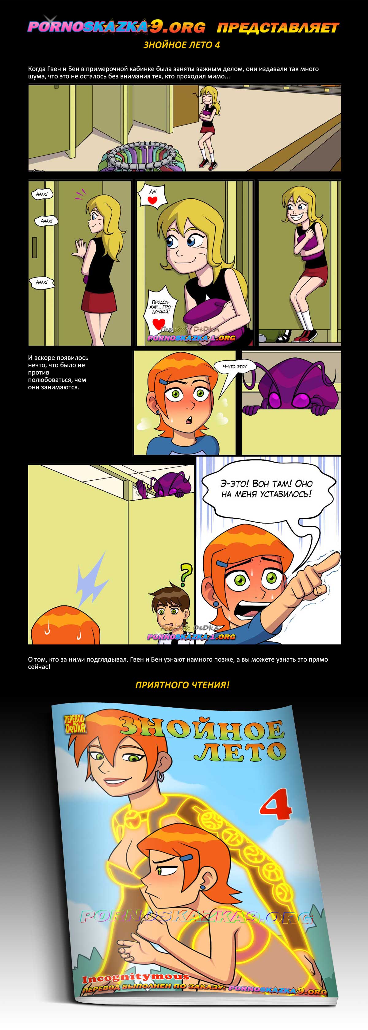Когда Гвен и Бен в примерочной кабинке была заняты важным делом, они издавали так много шума, что это не осталось без внимания тех, кто проходил мимо. И вскоре появилось нечто, что было не против полюбоваться, чем они занимаются. О том, кто за ними подглядывал, Гвен и Бен узнают намного позже, а вы можете узнать это прямо сейчас!